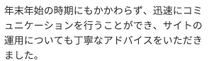 緊急度の高い内容については迅速な対応が求められます。遅くとも半日以内の即レスで迅速な対応を心がけておりますので、安心したやりとりが可能です。